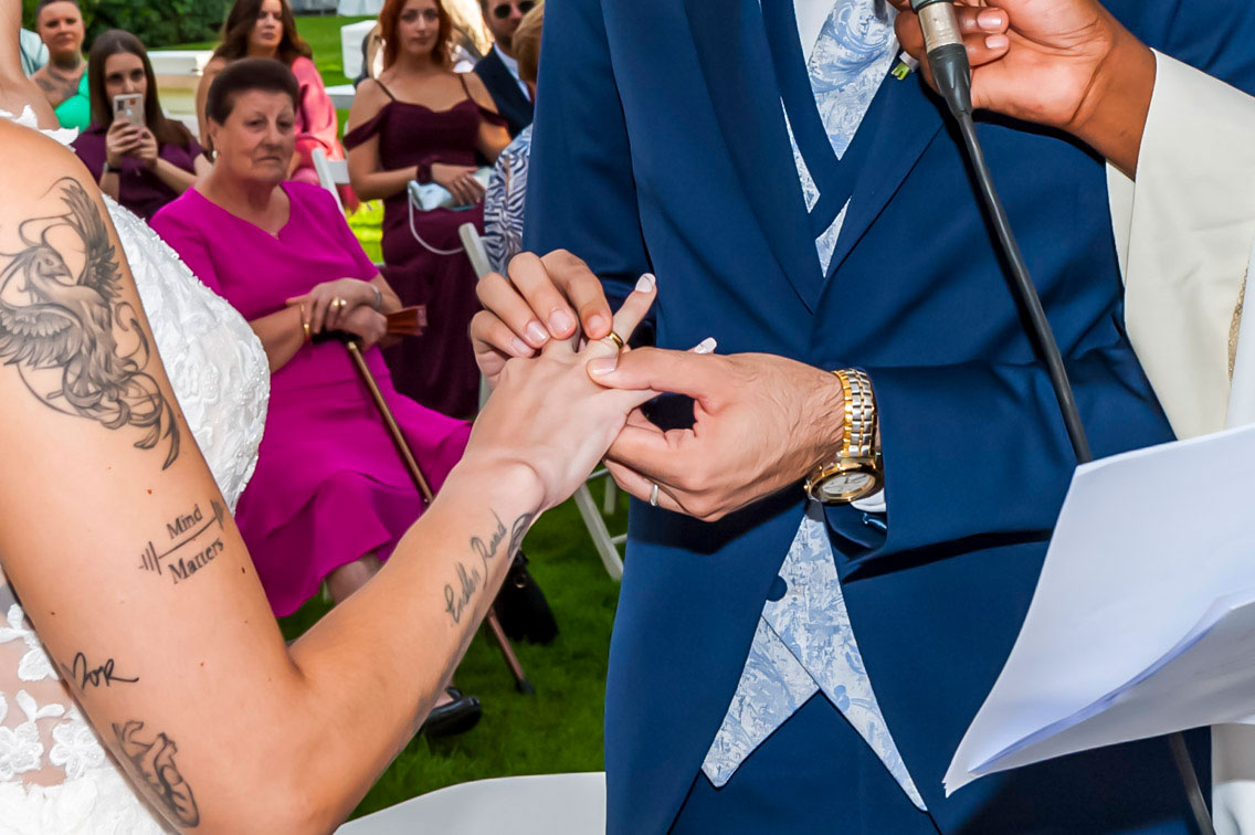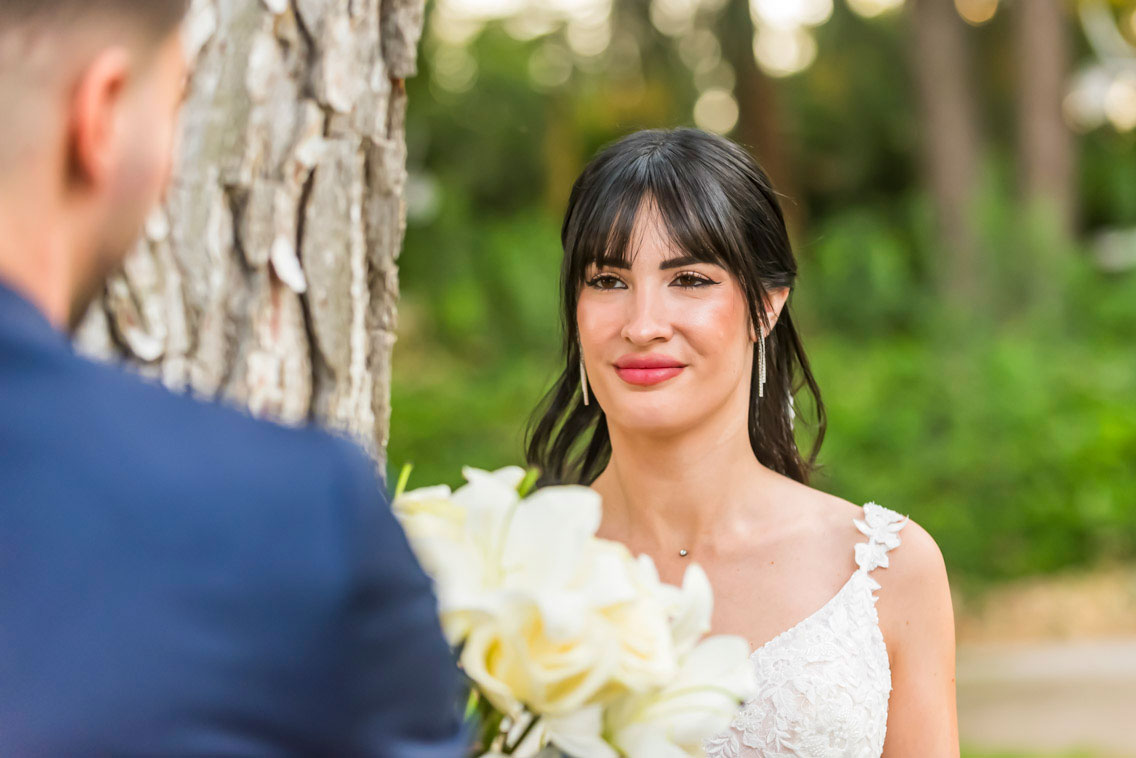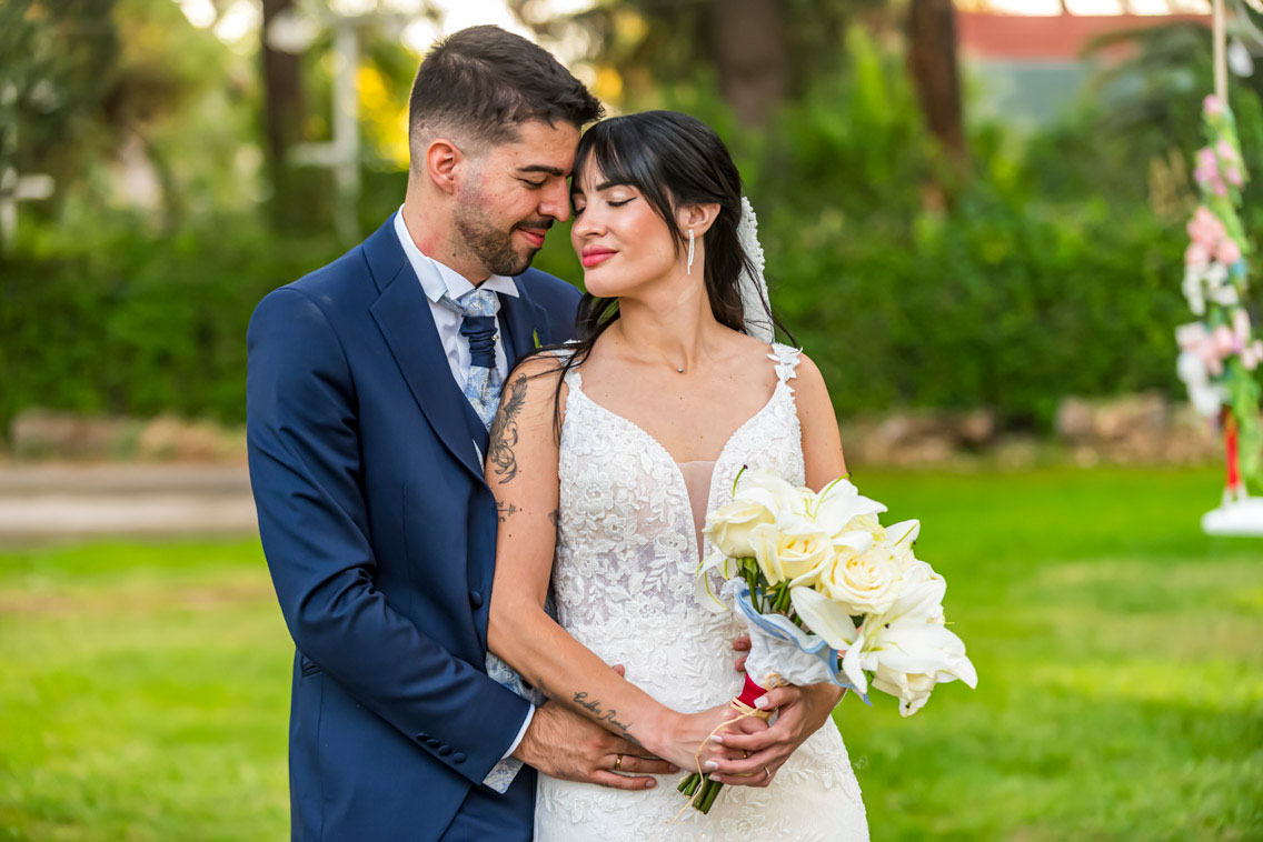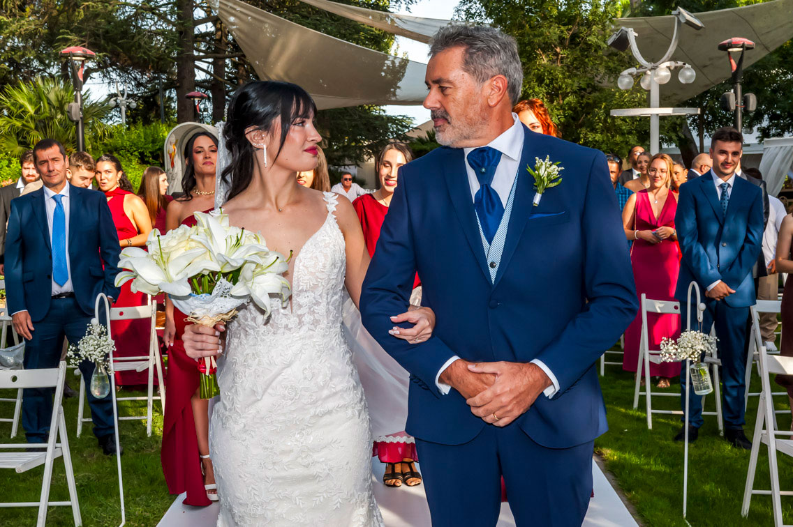Los novios se casaron con Ceremonia Religiosa celebrada all铆 mismo en los jardines de la finca. Muy bien preparado el escenario, decorada, y con escenas llenas de emoci贸n. Desde la entrada de los novios hasta el final, todo transcurr铆a con intensidad y emociones, especialmente en el momento de los discursos de los familiares y amigos.